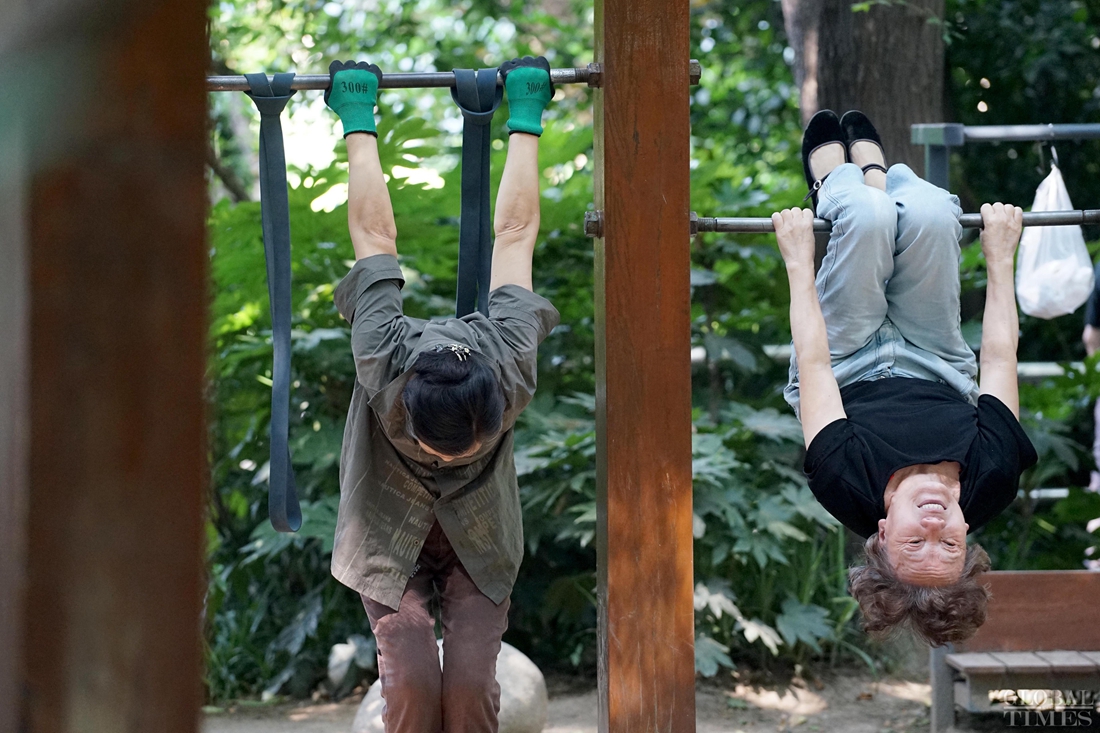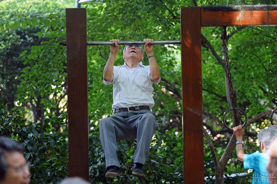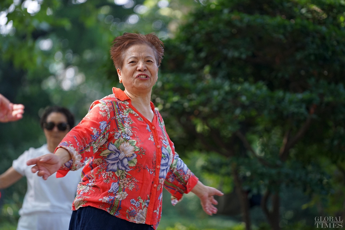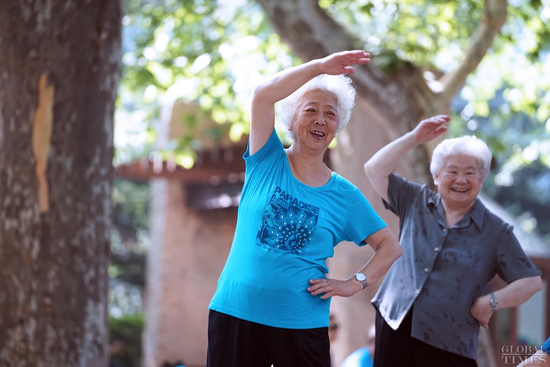 Seniors do various morning exercises to stay active in downtown Shanghai’s Jing’an Park on Wednesday. Photo: Chen Xia/GT figcaption >