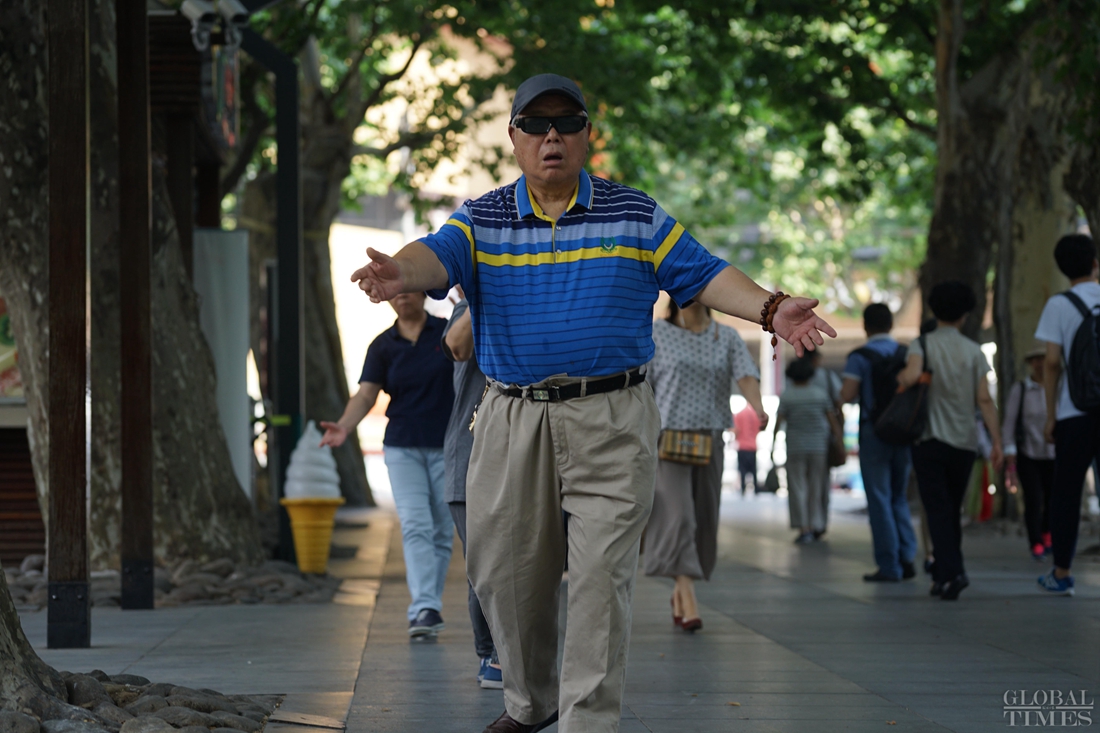 An elderly man does his morning exercises in downtown Shanghai’s Jing’an Park on Wednesday. Photo: Chen Xia/GT figcaption >