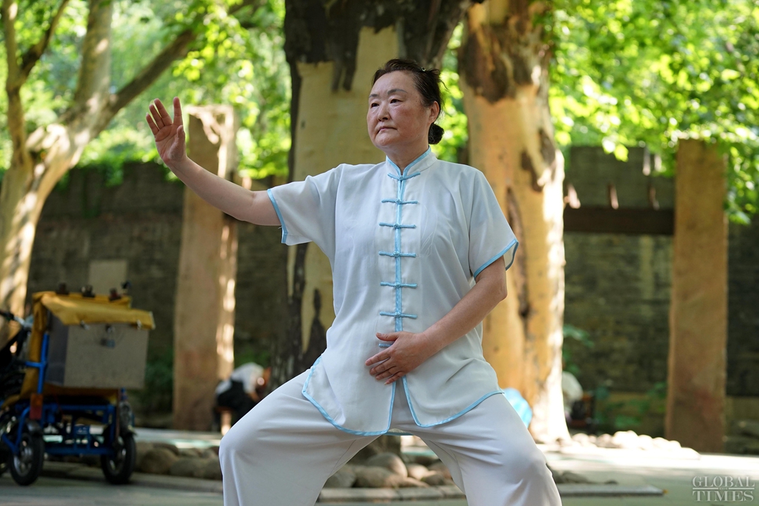 An elderly woman practices Tai Chi in downtown Shanghai’s Jing’an Park on Wednesday. Photo: Chen Xia/GT figcaption >