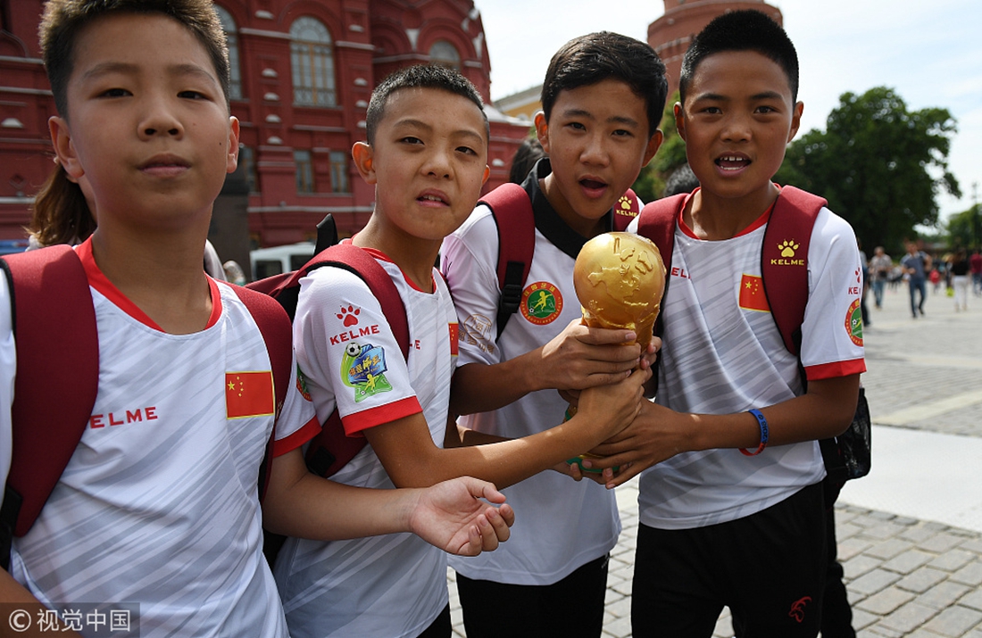 The Chinese ball boys hold a replica of the World Cup trophy in Moscow, Russia, ahead of the 2018 FIFA World Cup on June 13, 2018. They will take to the pitch with the Russian national team during the opening match of the 2018 FIFA World Cup. (Photo: VCG)