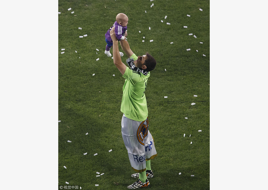 Iker Casillas plays with his son during the Real Madrid celebration after winning the UEFA Champions League Final at the Santiago Bernabeu Stadium in Madrid, Spain, on May 25, 2014. Photo: VCG figcaption >