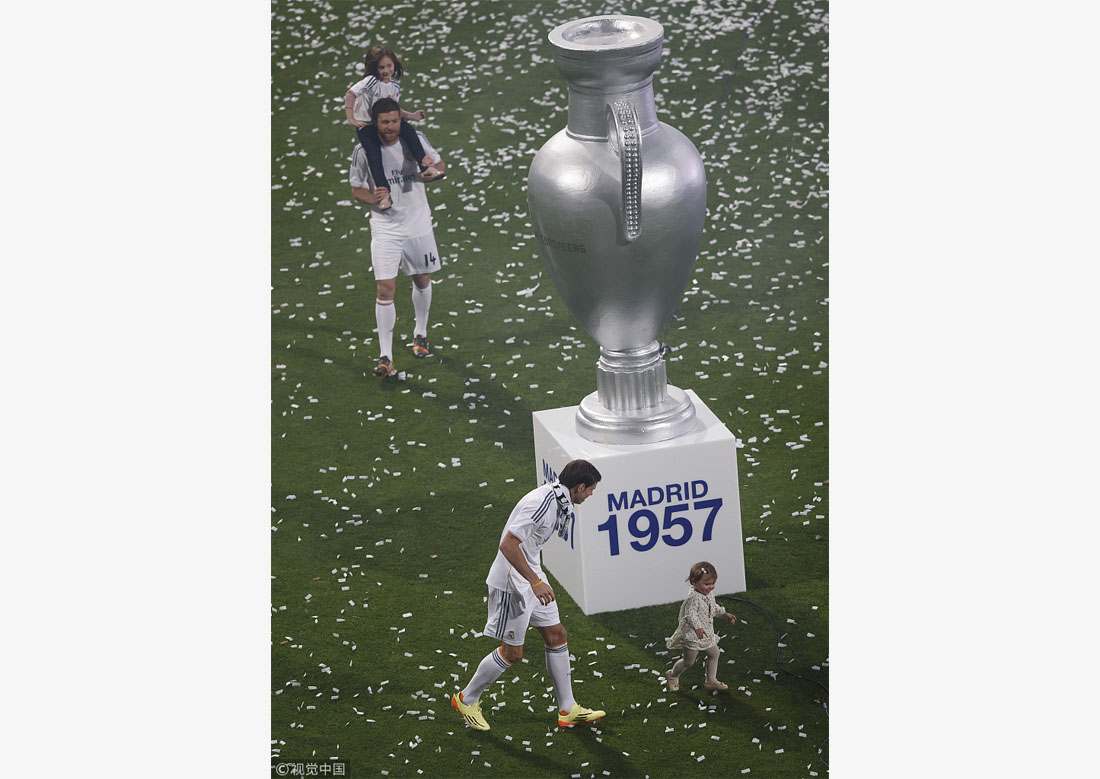 Gareth Bale (left) and Xabi Alonso (center) play with their daughters during the Real Madrid celebration after winning the UEFA Champions League Final at Santiago Bernabeu Stadium in Madrid, Spain, on May 25, 2014. Photo: VCG figcaption >