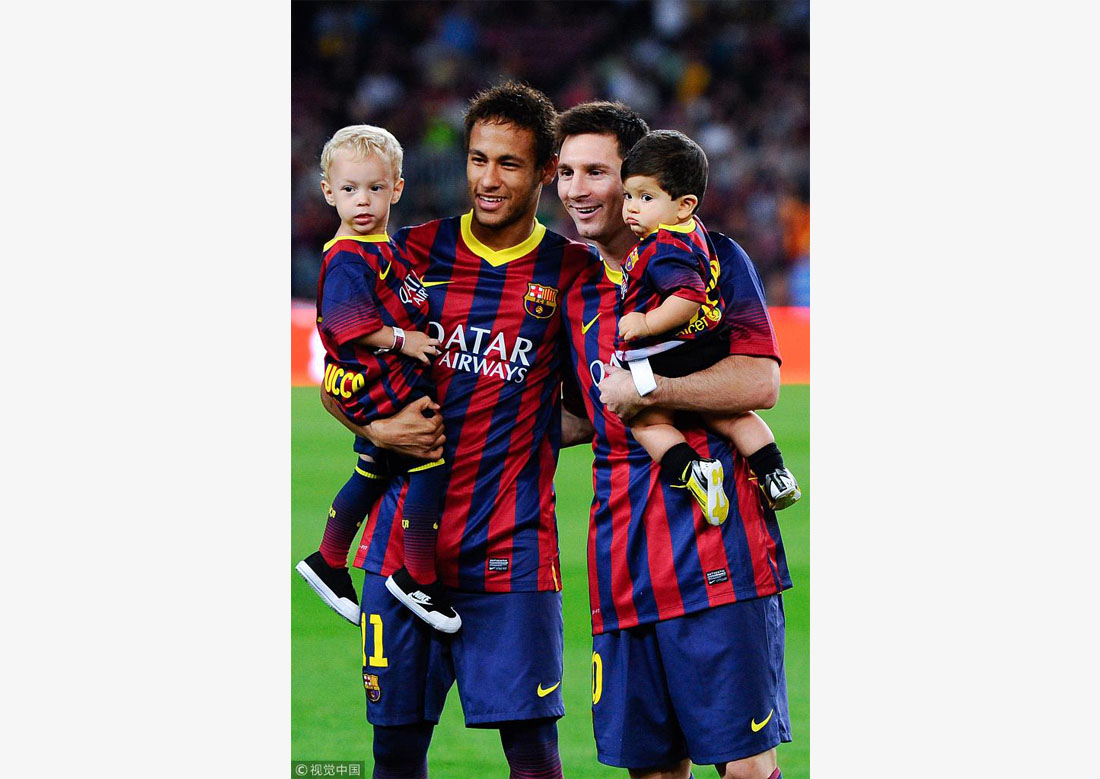 FC Barcelona players Neymar (left), with his son Davi Lucca, and his teammate Lionel Messi (right), with his son Thiago, pose for a photo prior to the La Liga match between FC Barcelona and Real Sociedad de Futbol at Camp Nou in Barcelona, Spain, on September 24, 2013. Photo: VCG figcaption >