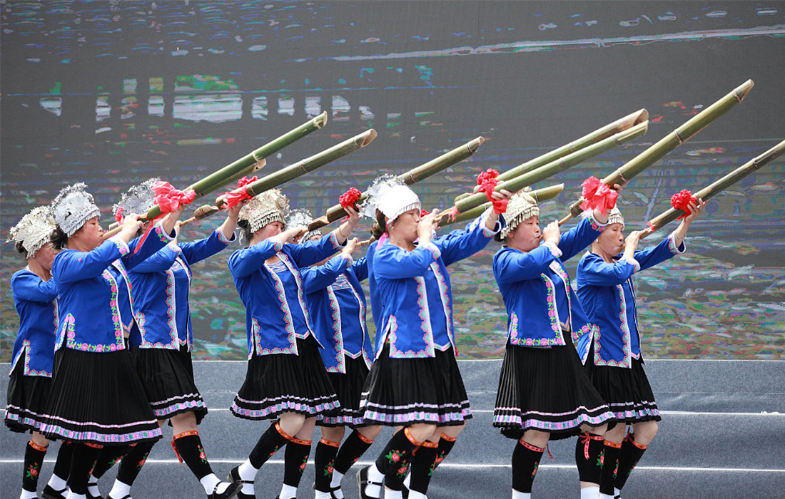 Musicians perform using lusheng, a Miao traditional instrument, during the 7th Longji Terrace Culture Festival in Longsheng Various Nationality Autonomous County of Guilin City, South China's Guangxi Zhuang Autonomous Region, on June 28, 2018. Photo: VCG figcaption >
