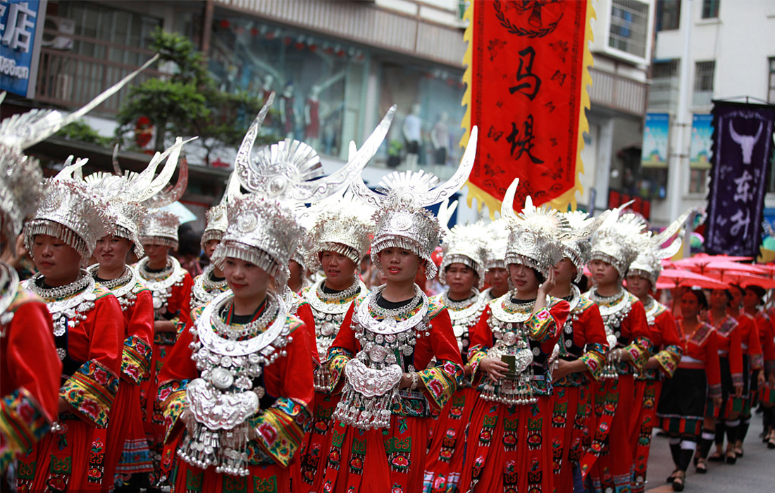 People of the Miao ethnic minority hold a parade dressed in traditional Miao costumes during the 7th Longji Terrace Culture Festival in Longsheng Various Nationality Autonomous County of Guilin City, South China's Guangxi Zhuang Autonomous Region, on June 28, 2018. Photo: VCG figcaption >