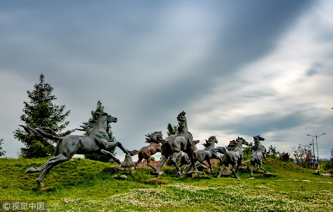 A photo taken on June 5 shows a sculpture of horses galloping through a field in Tekes county in Xinjiang. Photo: VCG figcaption >