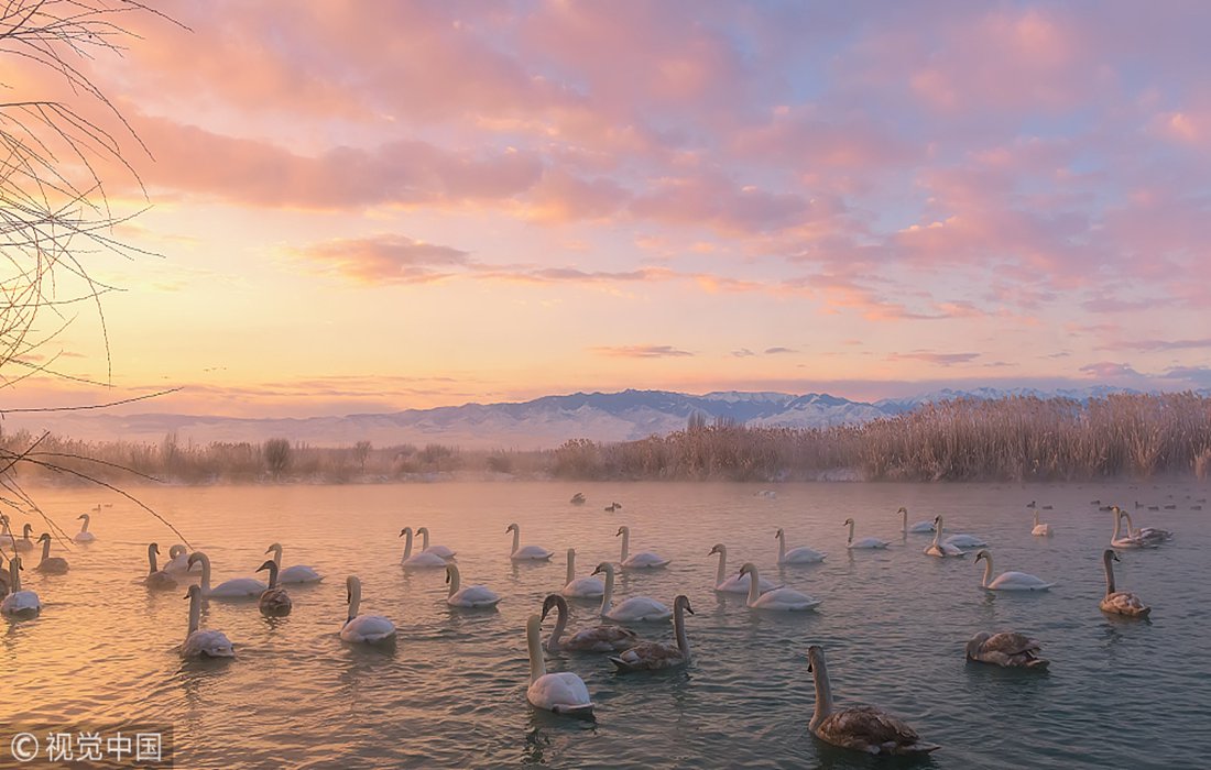 Swans swim in Swan Lake in the Ili River Valley in Yining County, Northwest China's Xinjiang Uyghur Autonomous Region, on January 6, 2018. Photo: VCG figcaption >