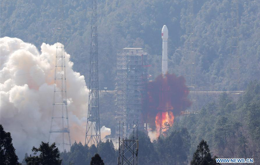 China successfully launches twin BeiDou-3 navigation satellites into orbit on a single carrier rocket, the Long March-3B, from the Xichang Satellite Launch Center, Southwest China's Sichuan Province, on February 12, 2018. Photo: Xinhua figcaption >