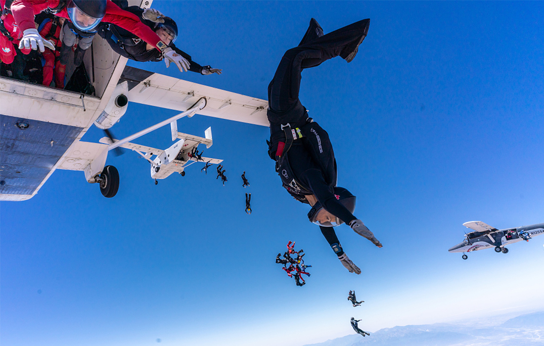 Skydivers jump from three planes before spelling “PEACE” on June 24, 2018. The event took place at Skydive Perris and was organized by six-time skydive world champion Dan Brodsky-Chenfeld and P3 Skydiving in Perris, California, USA. Photo: VCG figcaption >
