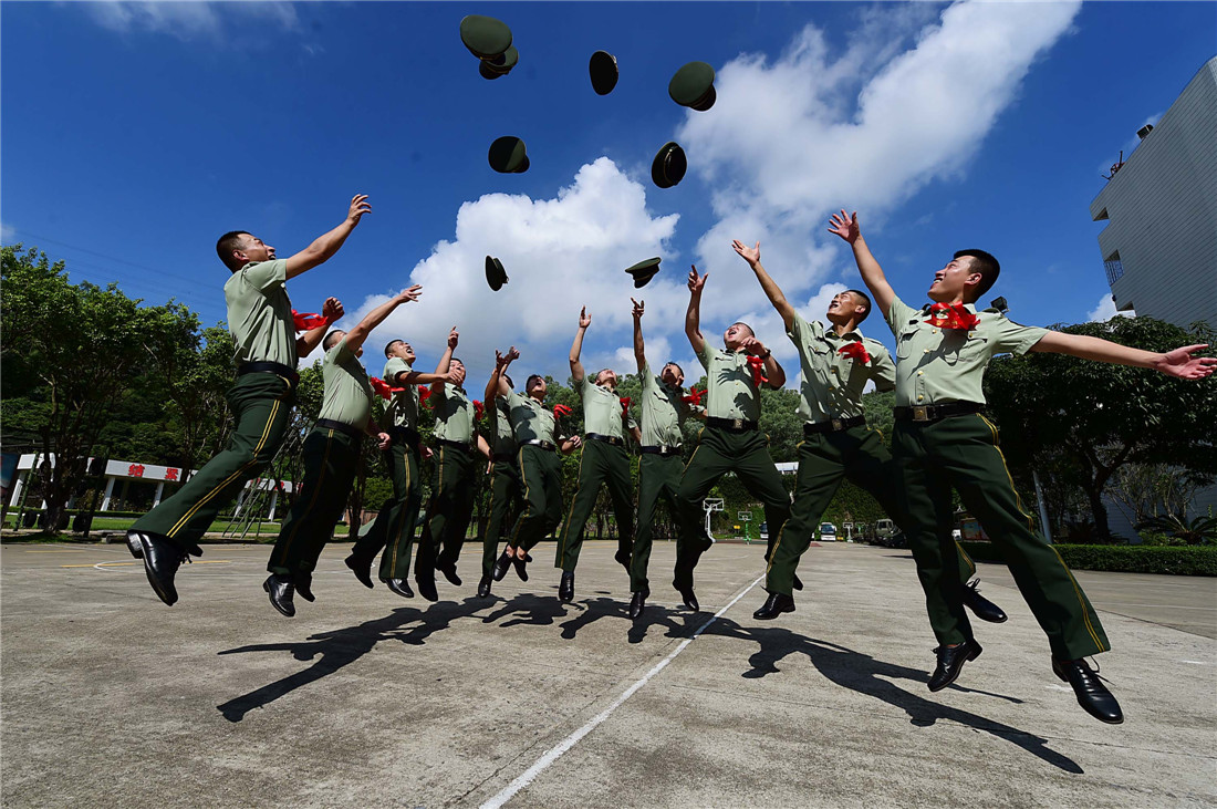Veterans throw their caps in celebration after fulfilling their service in Shenzhen, Guangdong Province on September 4. figcaption >