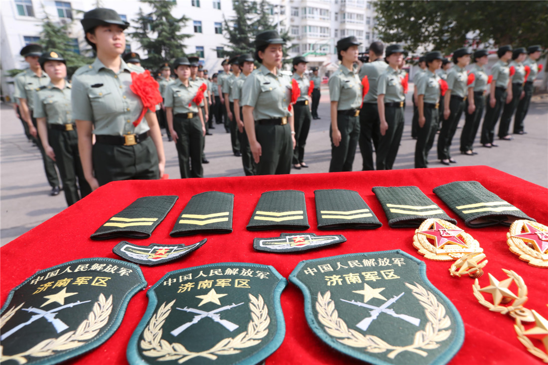 Female soldiers take part in a farewell ceremony in Jinan, Shandong Province on September 6, during which they removed their epaulettes and badges.
