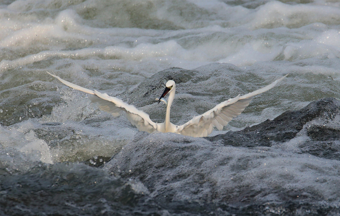 Egret catches fish on the Xin’an River in Huangshan, China's Anhui