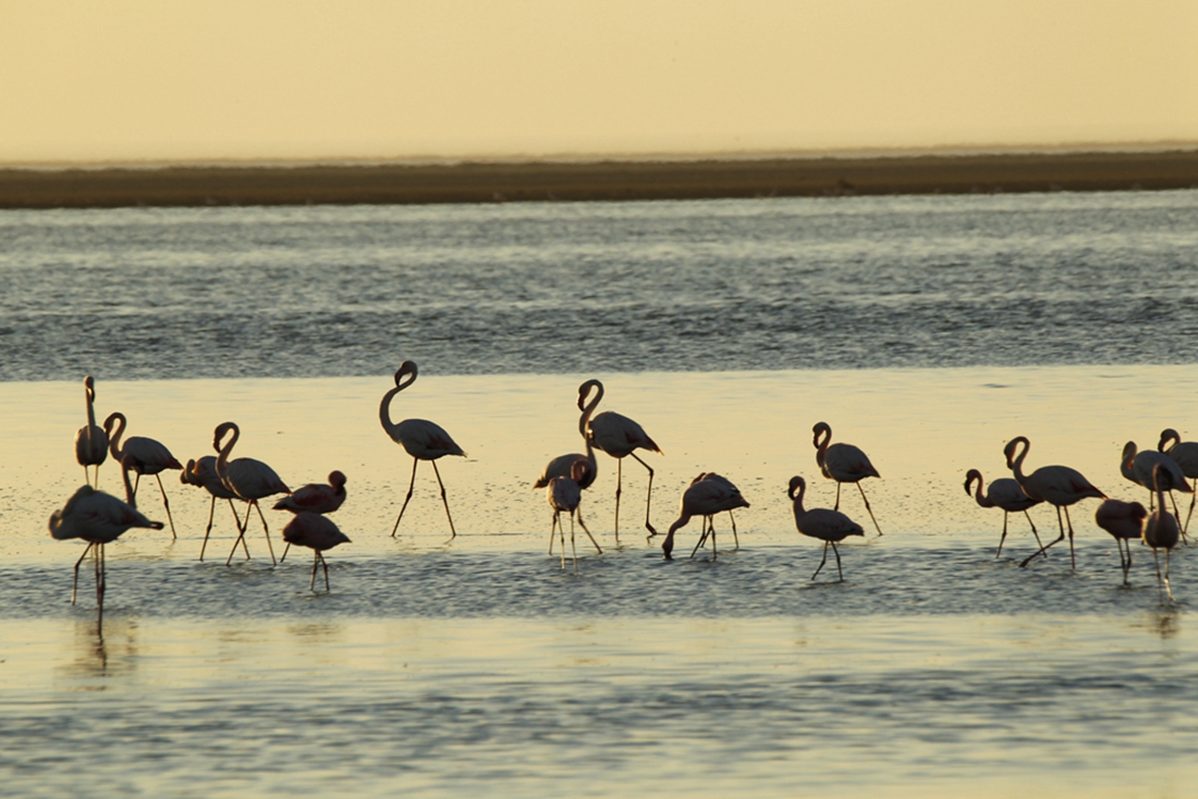 Flamingos rest in a lake near Walvis Bay in Namibia
