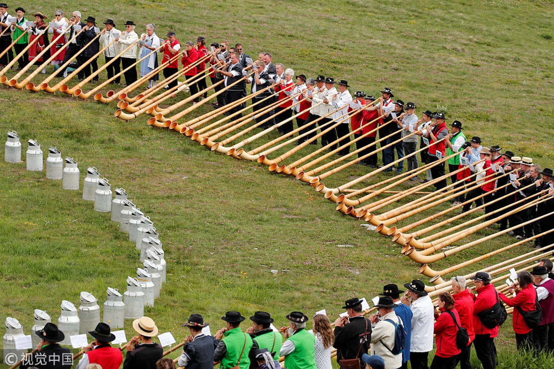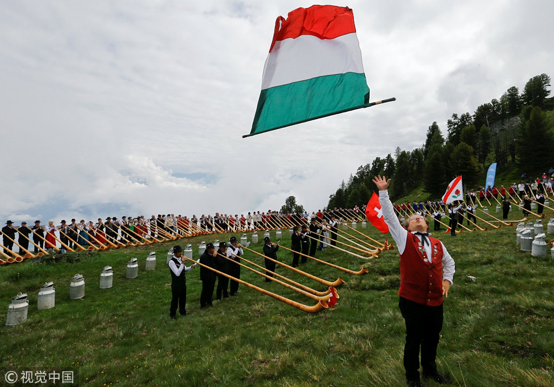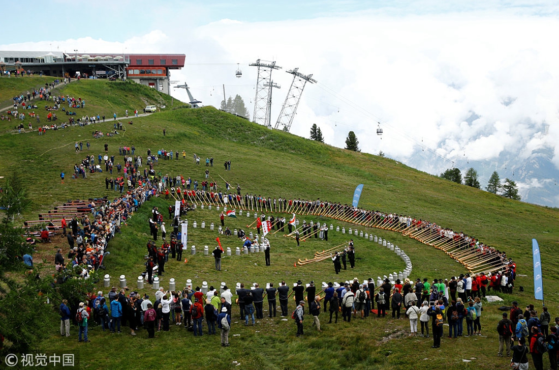 Alphorn blowers perform an ensemble piece at the Alphorn International Festival on the alp of Tracouet in Nendaz, Switzerland, on July 22, 2018. (Photos: Denis Balibouse/VCG)
