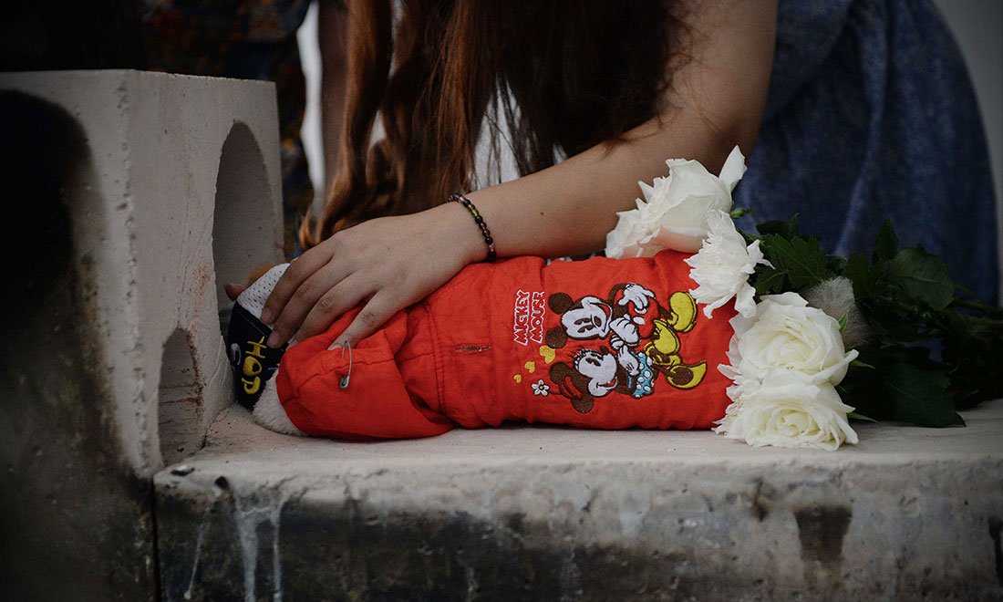 The owner and her daughter weep at the casket of their pet dog at its funeral on August 29. figcaption >