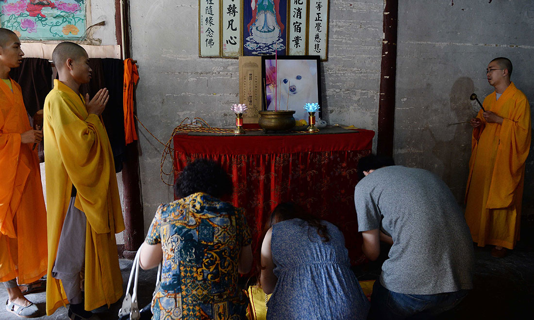 The pet owner and her family kowtow in front of the dog’s portrait during a Buddhist funerary ceremony at a temple in Shanghai. According to Buddhist belief, the rite is held to atone for the sins of the dead. figcaption >