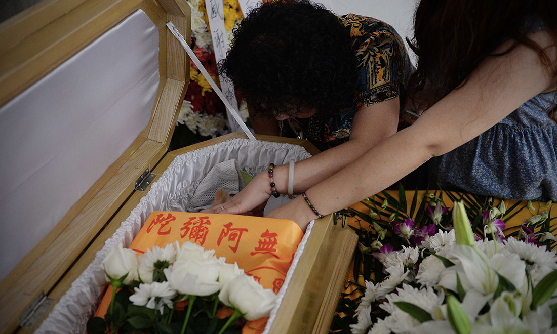 The departed dog lies in a casket draped in a yellow scarf that reads the Buddhist blessing “Amitabha” during the funeral ceremony in Shanghai on August 29. Photos: CFP