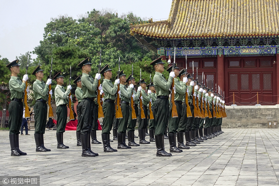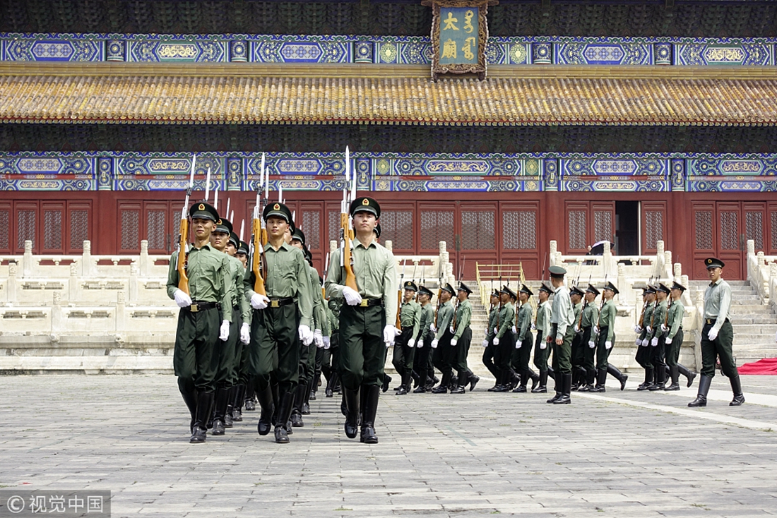 Soldiers from China’s military honor guard took part in a training exercise while temperatures soared at the Imperial Ancestral Temple (Taimiao) in Beijing on July 31, 2018. (Photo: VCG) figcaption >