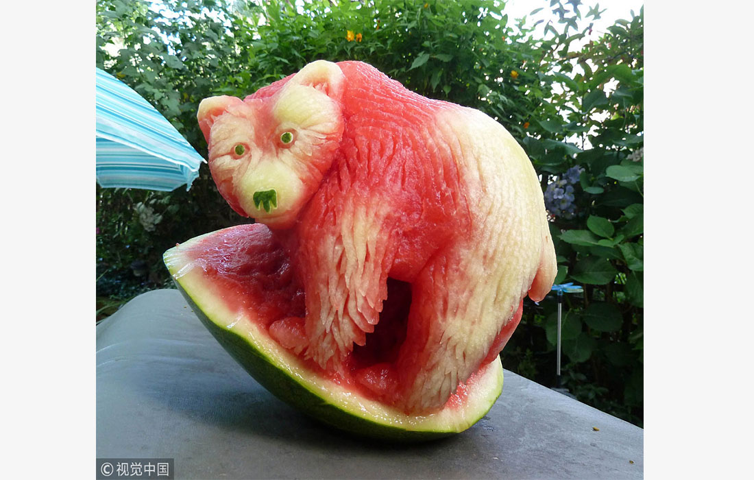 An artist has carved the likeness of a bear from a watermelon. Photo: VCG figcaption >