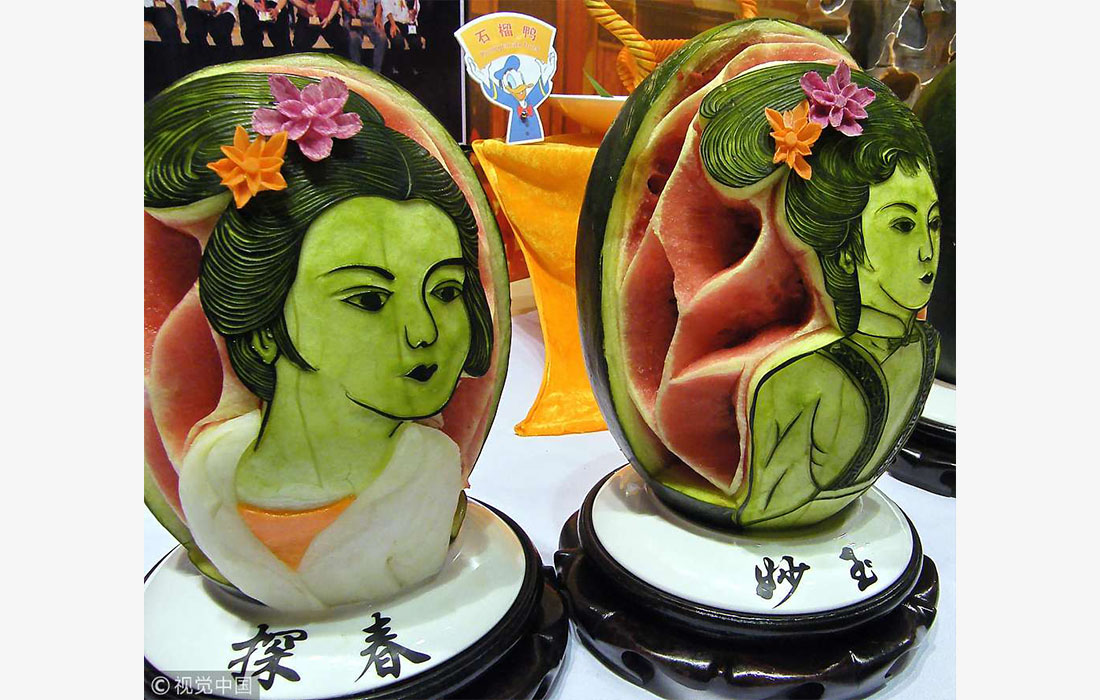 Two watermelons are carved into two of the characters from the Chinese classic A Dream of the Red Mansion. Photo: VCG figcaption >