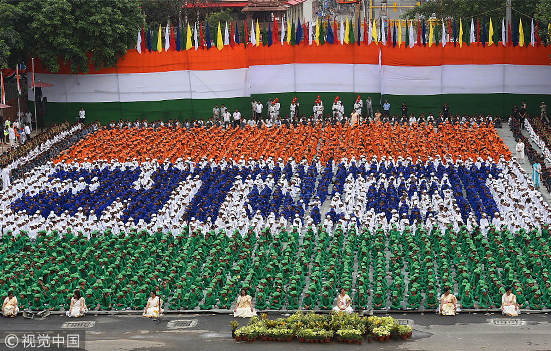 School children in their costumes sit in formation during a full dress rehearsal for the Indian Independence Day celebration at Red Fort in New Delhi, India, on August 13, 2018. (Photo: VCG)