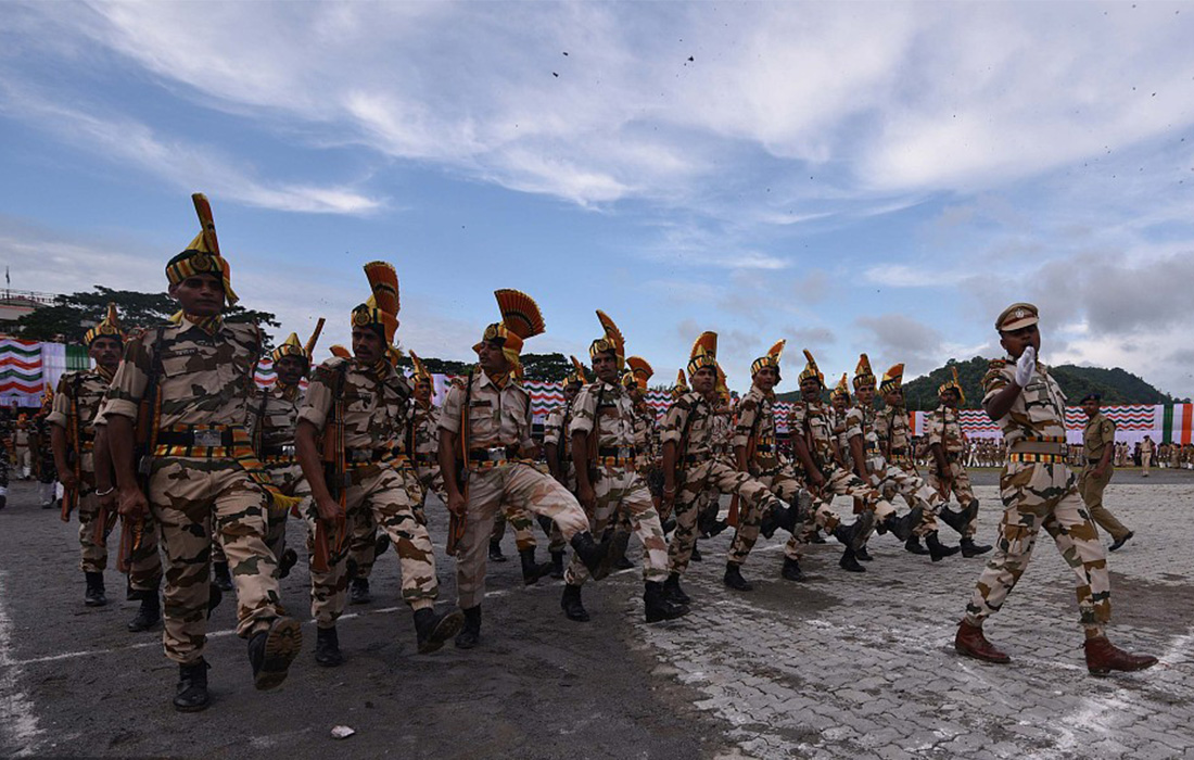 Indian paramilitary soldiers practice marching during a full dress rehearsal for India's Independence Day parade in Guwahati, India, on August 13, 2018. (Photo: VCG) figcaption >