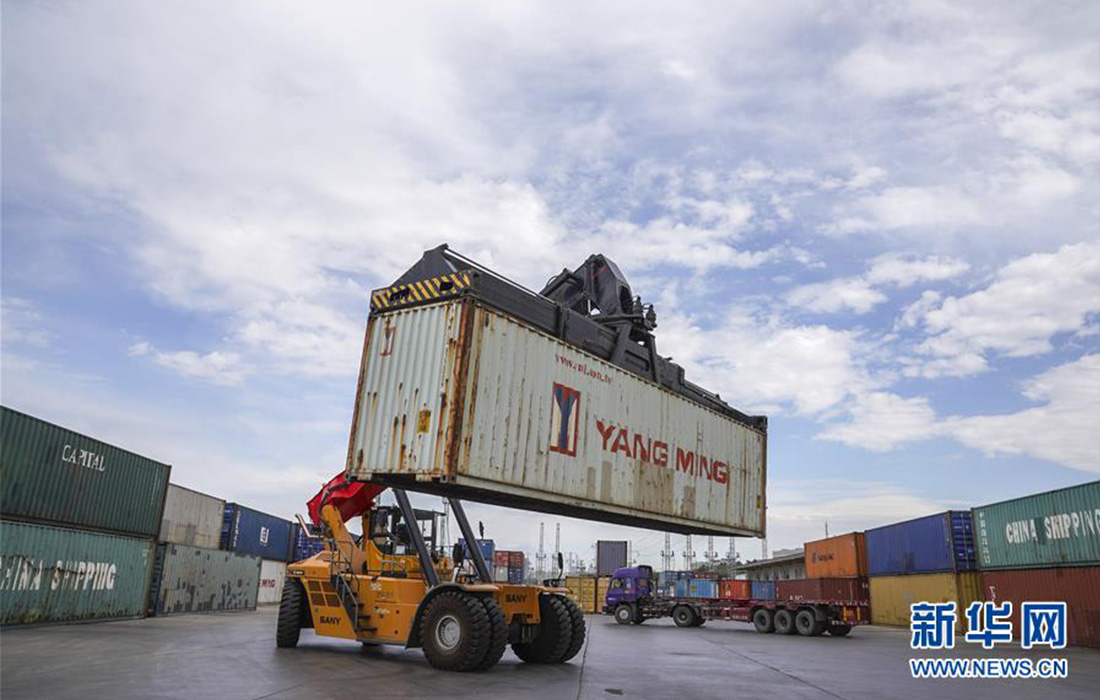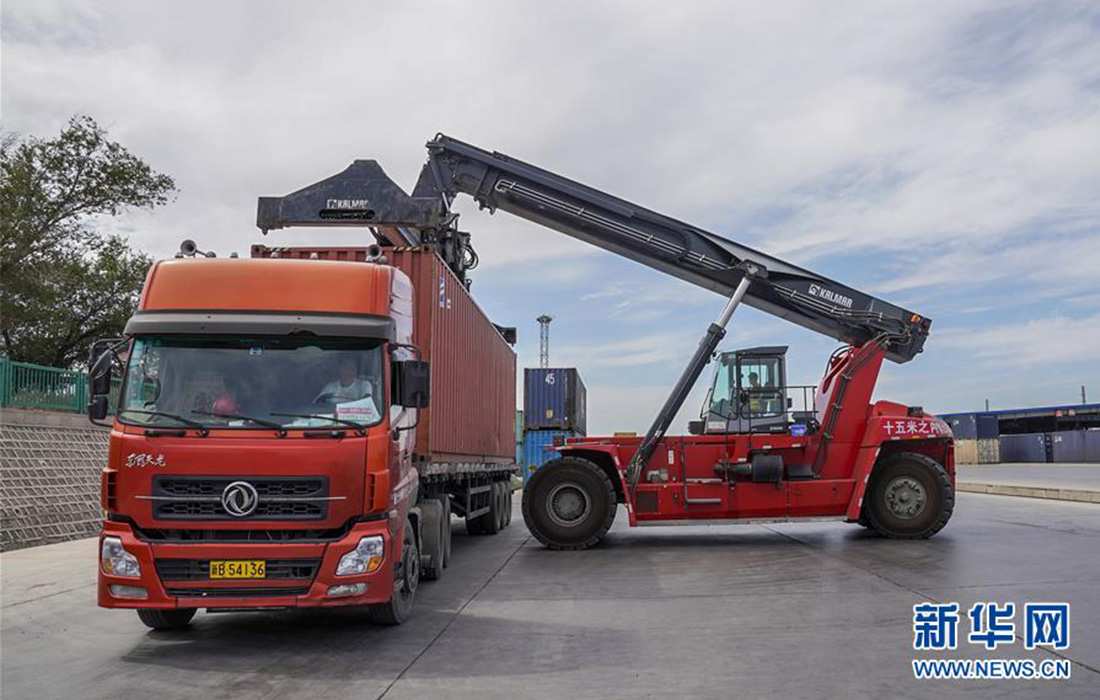 A worker operates a shipping container crane to unload a freight container at the Urumqi transport hub, Xinjiang Uyghur Autonomous Region, on August 9, 2018. Photo: Xinhua figcaption >