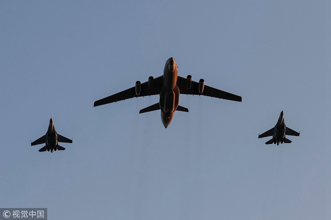 Ukrainian military planes do a flyby during the rehearsal for the Independence Day military parade in Kiev, Ukraine, on August 20, 2018. Photo: Gleb Garanich/VCG figcaption >