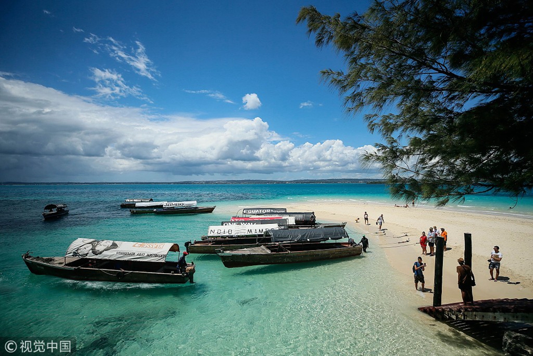 Boats are anchored along the beaches of Changuu Island, which is also known as Prison Island and is 5.6 kilometers away from Zanzibar, Tanzania, on August 20, 2018. Photo: Mahmut Serdar Alakus/Anadolu Agency/Getty Images/VCG figcaption >