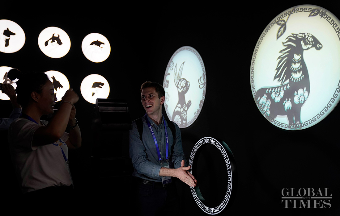 A visitor tries out an AI system that matches his hand gestures with a shadow puppet animal. Photo: Yang Hui/GT figcaption >