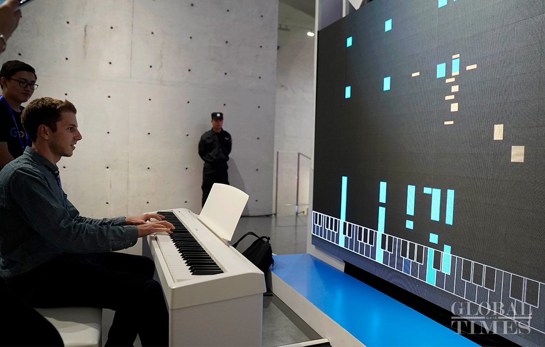A visitor tries out an AI keyboard, which can produce music based on the prelude they just played. Photo: Yang Hui/GT figcaption >