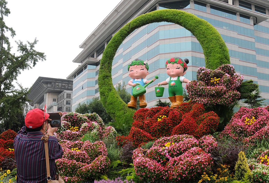 Beijing welcomes upcoming Mid-Autumn Festival and National Day with flower sculptures