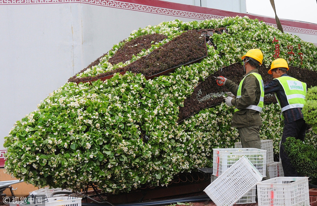 Workers sculpt a bullet train out of bushes and flowers on Chang'an Avenue in Beijing, China, on September 19, 2018. Photo: VCG figcaption >