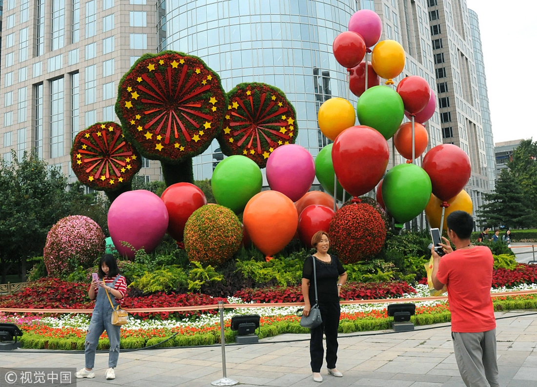 Tourists pose in front of a giant flower sculpture on Chang'an Avenue in Beijing, China, on September 19, 2018. Photo: VCG figcaption >