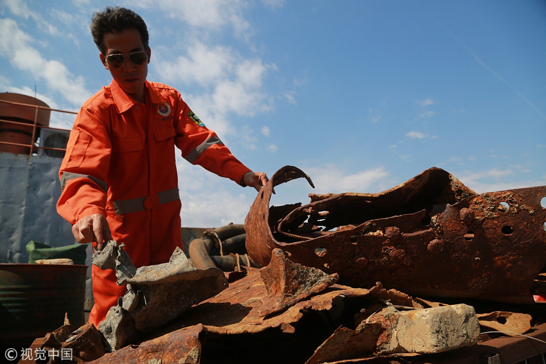 Some of the relics are placed in different boxes on the ship after being recovered from the Yellow Sea near Dalian, NE China’s Liaoning Province, on September 25, 2018. Photo: VCG figcaption >