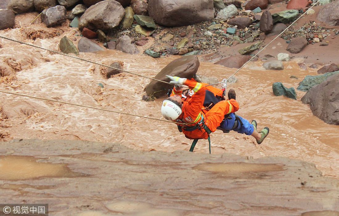 A firefighter uses a rope system to take a villager across a raging river in Zunyi, Southwest China’s Guizhou Province, on August 11, 2014. Photo: VCG figcaption >