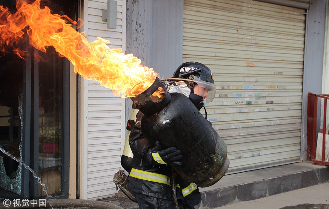 A firefighter risked his life by removing a burning gas container from a house in Wuhan, Central China’s Hubei Province, on April 17, 2014. Photo: VCG figcaption >