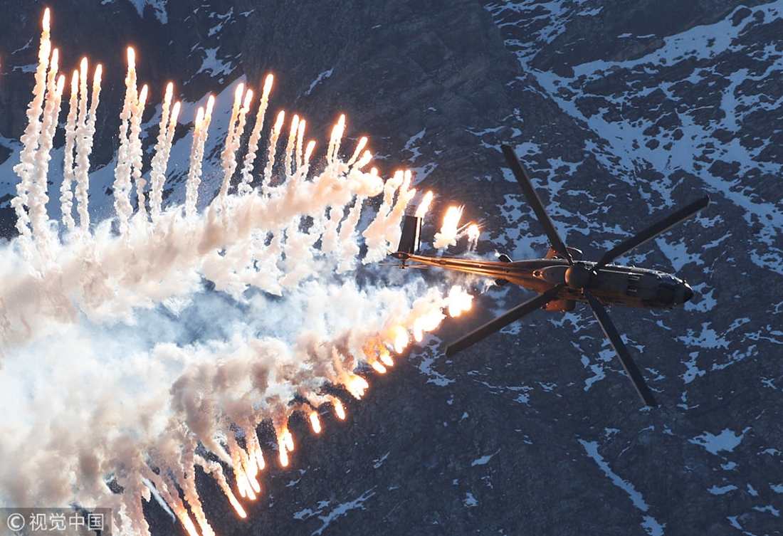 A Swiss Air Force Super Puma Cougar helicopter releases flares during a flight demonstration of the annual live fire drill over Axalp in the Bernese Oberland, Switzerland, on October 10, 2018. Photo: Arnd Wiegmann/VCG figcaption >