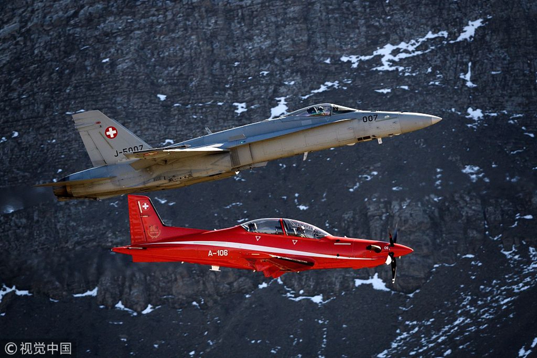 A F/A-18 Hornet fighter aircraft (above) flies next to a Pilatus PC-21 during the annual live fire drill of the Swiss Air Force over Axalp near Brienz, Switzerland in the Bernese Alps on October 10, 2018. Photo: Fabrice COFFRINI/VCG figcaption >