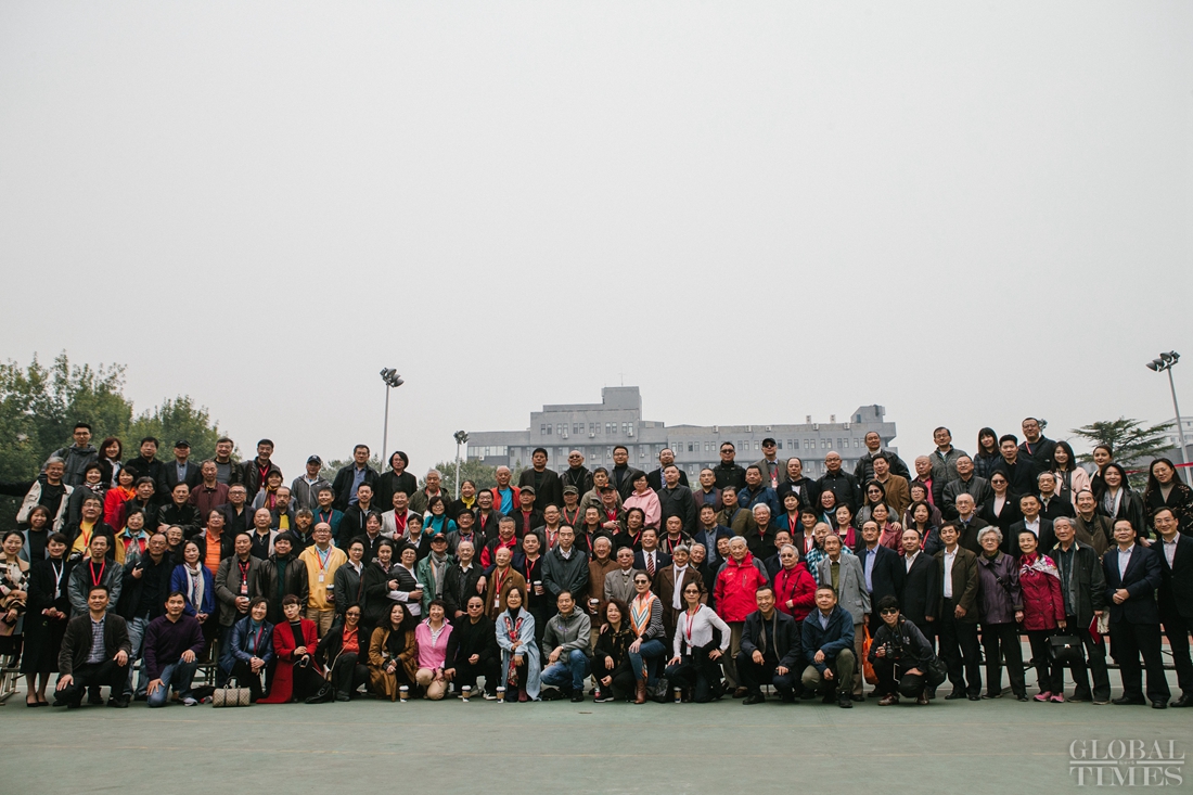 Chinese movie and TV star Zhang Fengyi (second right) poses for a photo with his classmates during the event at the Beijing Film Academy on. Photo: Li Hao/GT figcaption >