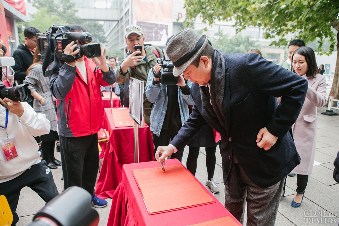 Chinese movie and TV star Zhang Tielin signs his name during an event at the Beijing Film Academy on October 15, 2018. Photo: Li Hao/GT figcaption >