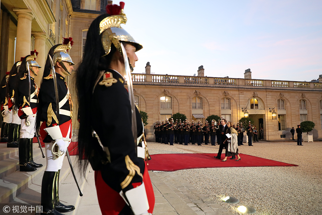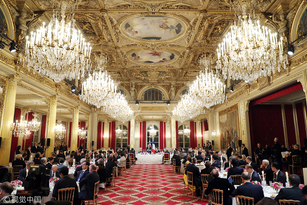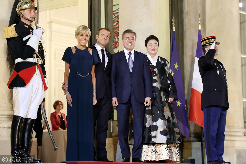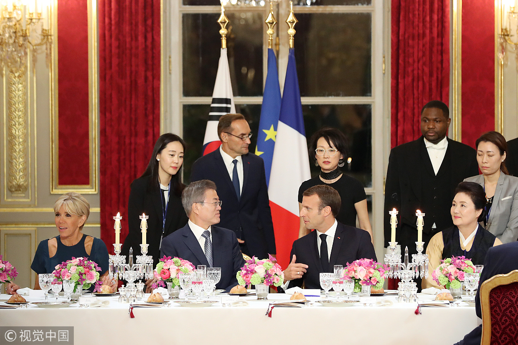 French President Emmanuel Macron and his wife held a state banquet for South Korean President Moon Jae-in and his wife at the Elysée Palace in Paris, France, on Tuesday. (Photos: VCG)
