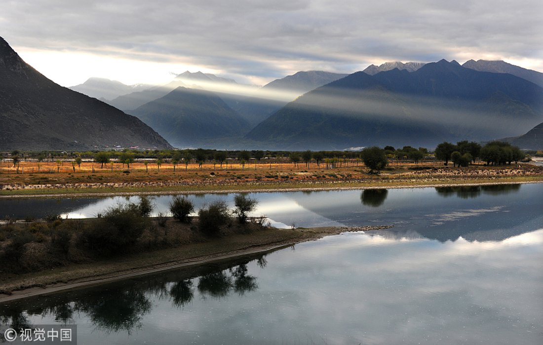 Yarlung Zangbo River, one of the highest major rivers in the world, glows warmly as it reflects the setting sun. Photo: VCG figcaption >