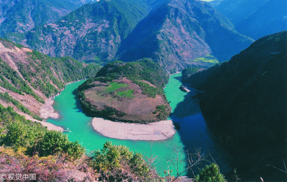 The Nujiang River, one of the main rivers in Southwest China, sparkles with deep blue-green as it cuts the mountains. Photo: VCG figcaption >