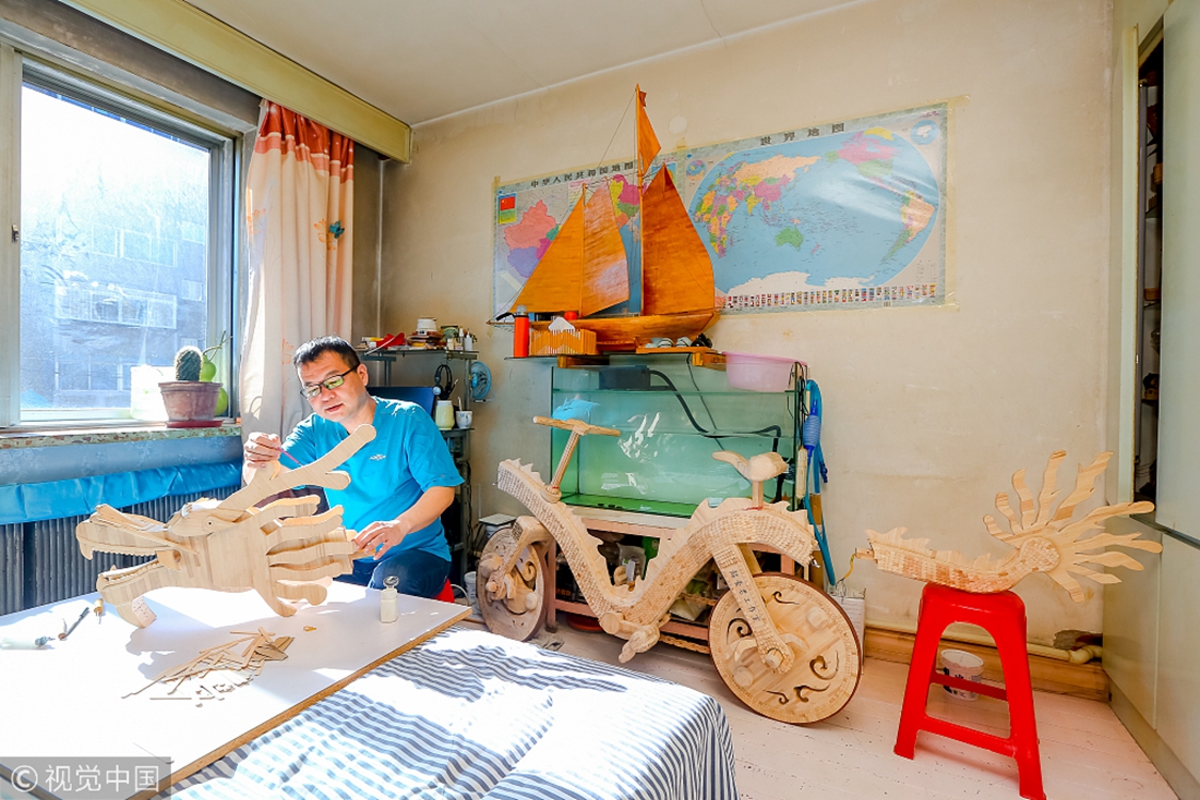 Sun Chao, the designer of dragon-shaped bicycle, repairs his creation at his home in Tieling, Northeast China’s Liaoning Province, on October 8, 2018. Photo: VCG figcaption >