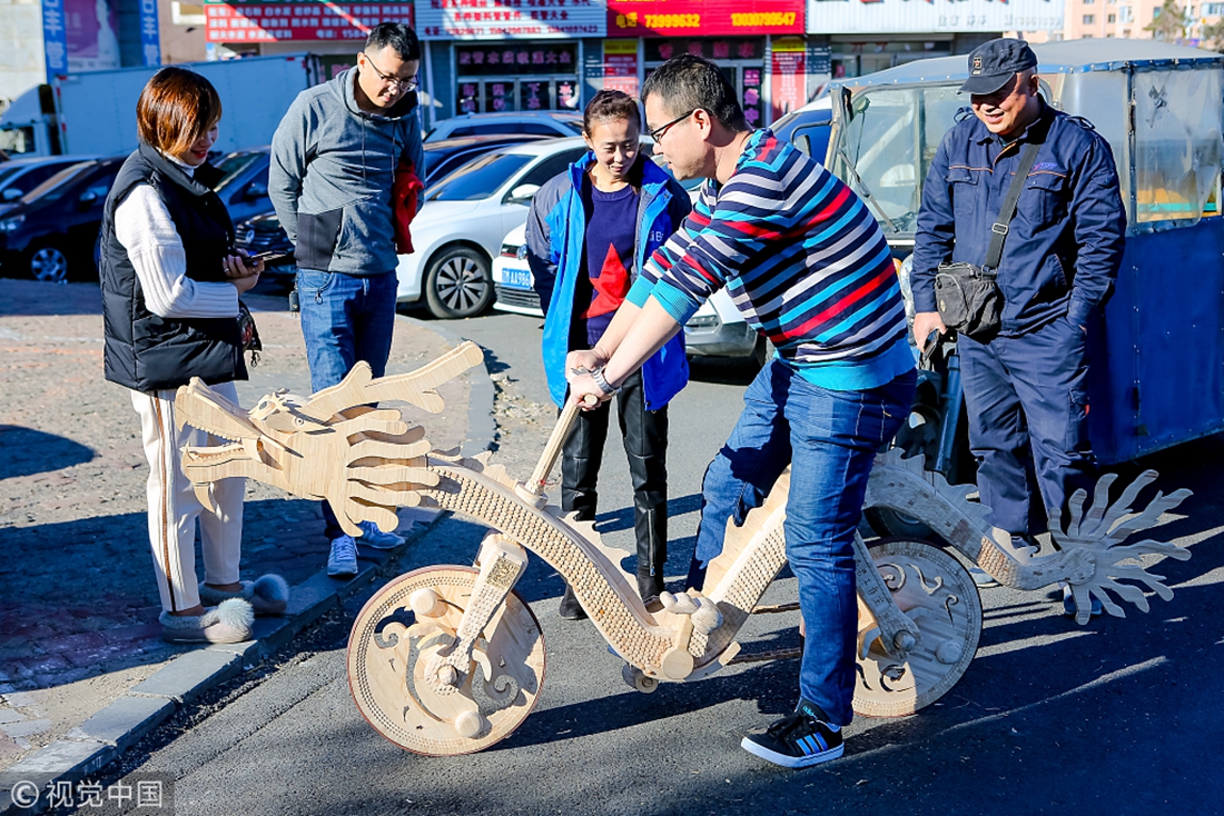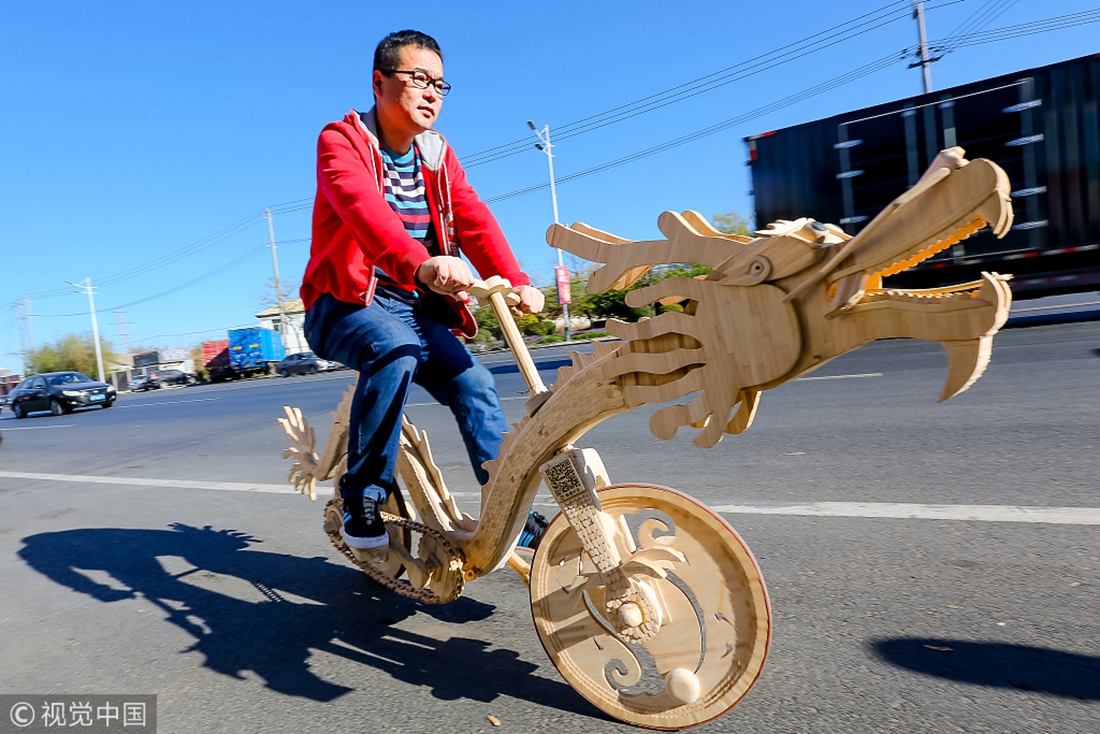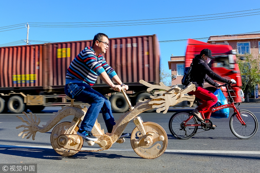 A dragon-shaped bicycle, constructed with 22,000 ice-cream sticks, was seen riding down the road in Tieling, Northeast China’s Liaoning Province, on October 8, 2018. The 2.45-meter long bicycle has interactive lights and sounds, and took Sun Chao, the designer, 10 months to finish. (Photos: VCG)