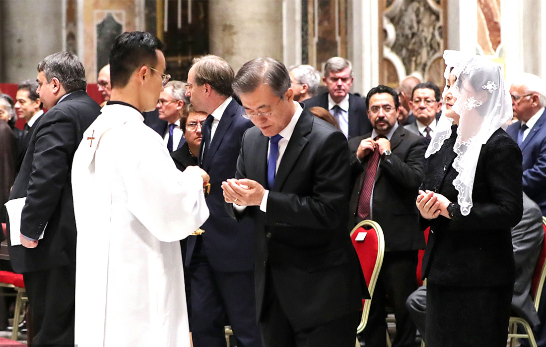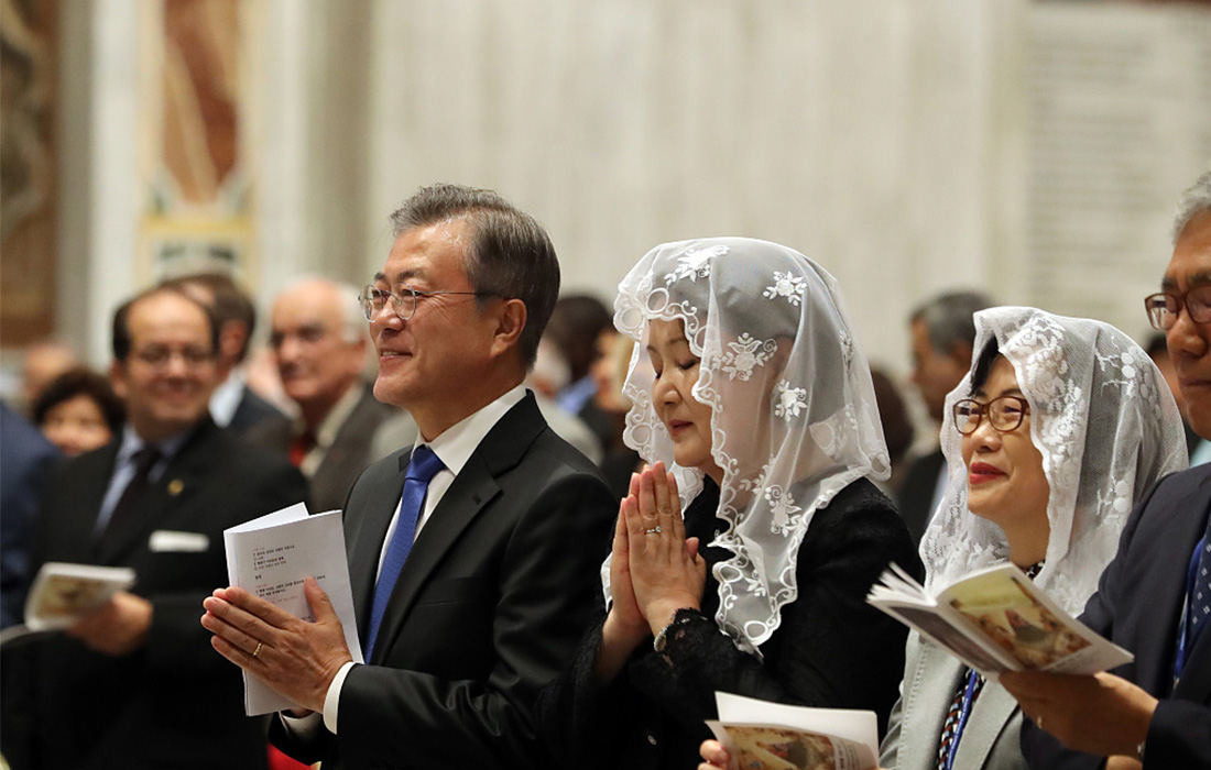 South Korean President Moon Jae-in (middle) participates in a special mass for peace on the Korean Peninsula at St. Peter's Basilica in the Vatican on October 17, 2018. Photo: VCG figcaption >