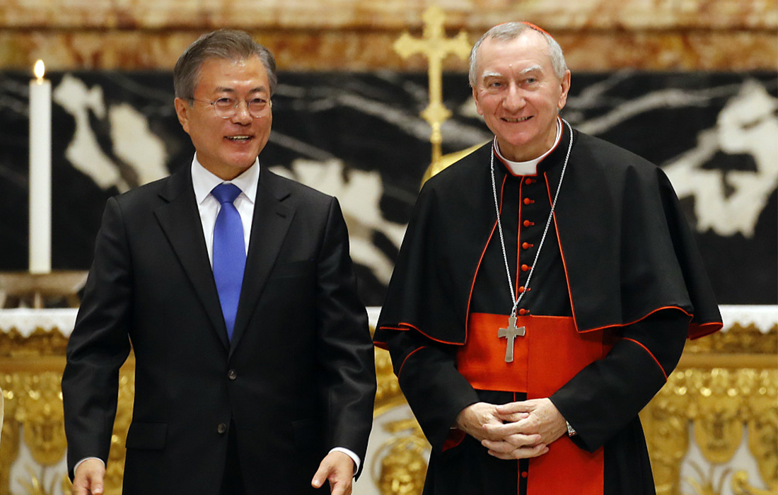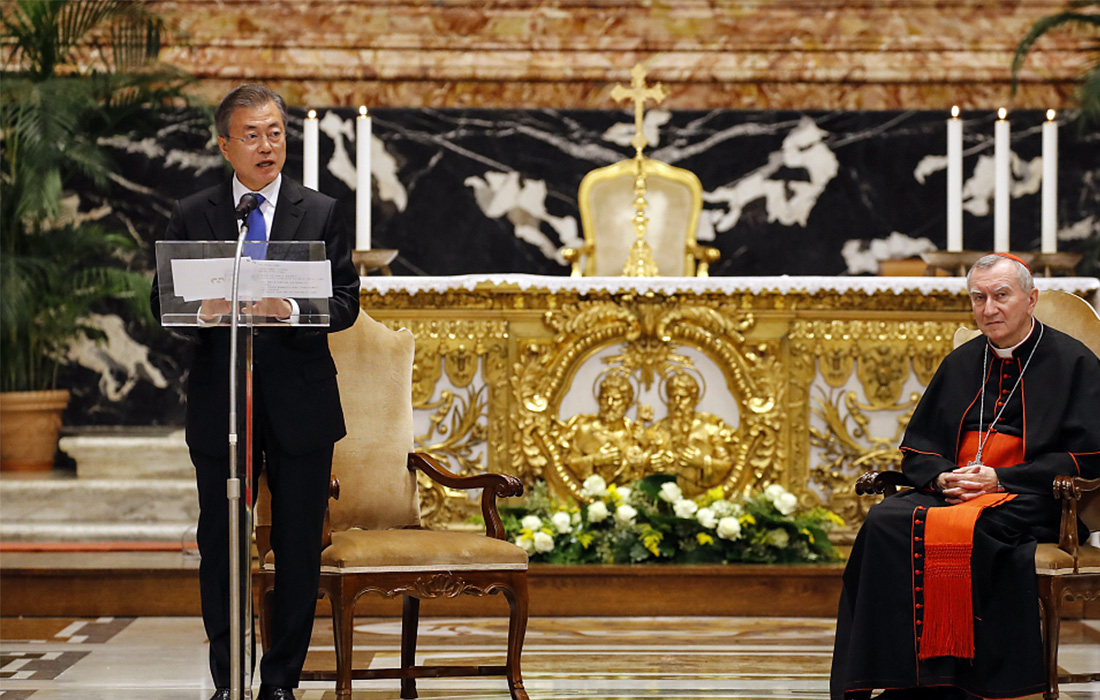 South Korean President Moon Jae-in (left) delivers a speech on the South Korean government striving for peace on the Korean Peninsula at St. Peter's Basilica in the Vatican. The special mass was presided over by Cardinal Secretary of State Pietro Parolin. Photo: VCG figcaption >