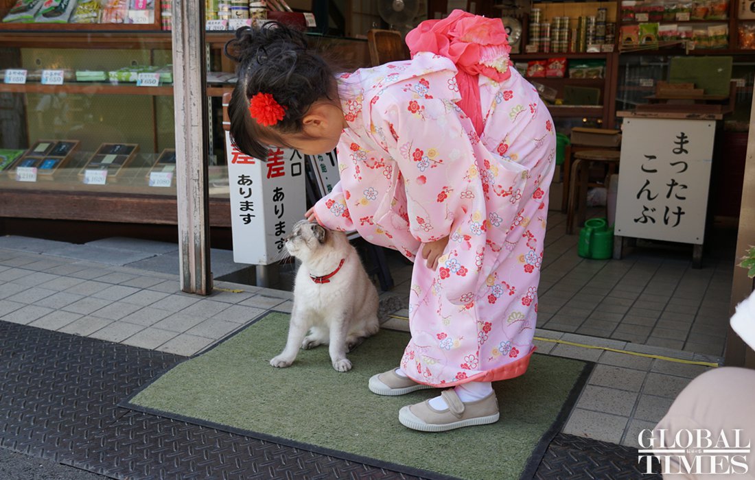 A girl dressed in a kimono softly pets a blind cat in Kyoto on Oct 24. Photo: Coutesy of Miao Jiang figcaption >