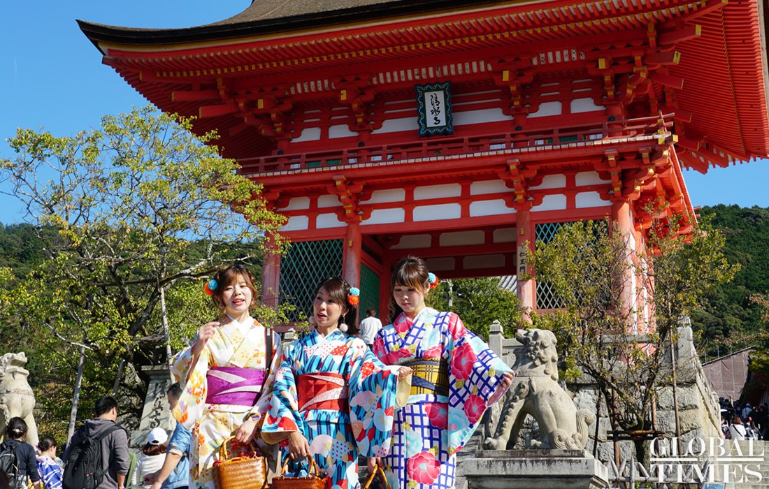 Women dressed in kimonos pose for photos in front of the Kiyomizu-dera Temple on October 24. Photo: Deng Zijun/GT figcaption >
